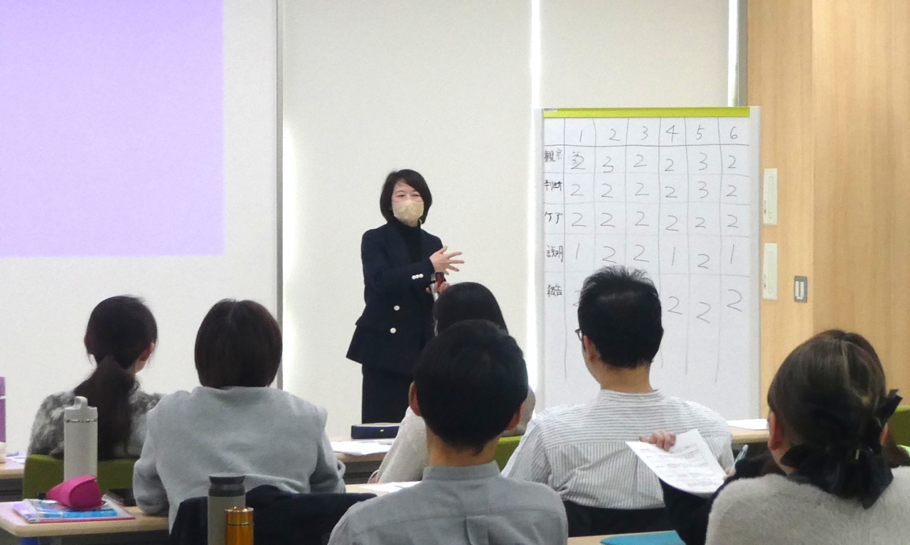 午前は、浜松医科大学医学部看護学科基礎看護学准教授の三浦友理子先生をお迎えして「評価について考えよう」と題してワークショップを行いました。キャッチフレーズは、「終わる評価から始まる評価へ」です。評価に対して前向きな気持ちになれる、自らの評価に対する傾向を考える研修となりました。